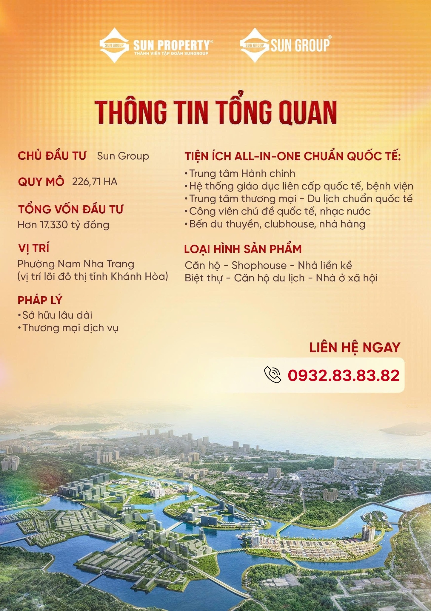 Dự án Sun Khánh Hòa được quy hoạch trên quỹ đất 227ha (trong đó có 67ha mặt nước, 167ha diện tích đất với mật độ xây dựng chỉ 26,7%), định hình như một đô thị đảo đa chức năng giữa lòng đô thị hiếm có ở miền Trung. Toàn khu được thiết kế theo mô hình “Ba đảo – Ba chất sống”, trong đó mỗi đảo mang một vai trò riêng biệt: đô thị sinh thái – thương mại, giải trí quốc tế và nghỉ dưỡng cao cấp.
