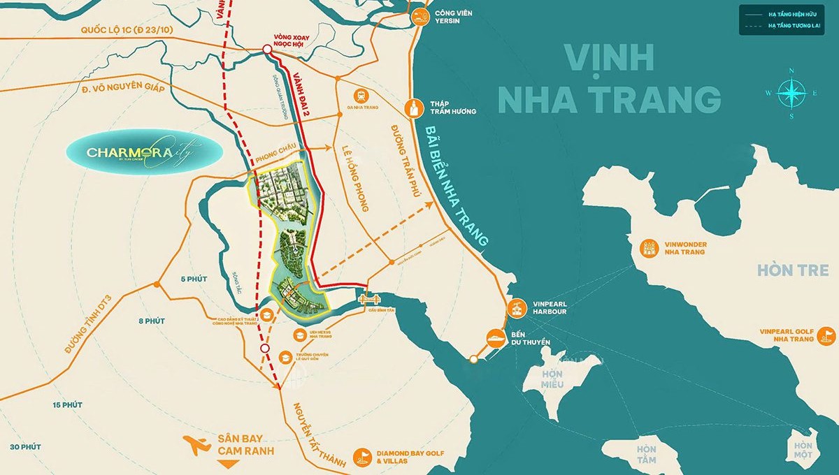 - Cận thị: Bên hông là các khu đô thị VCN, Hoàng Long, Hà Quang đã hình thành và trung tâm hình chính mới của Khánh Hòa sẽ dời về đải Up Town của Charmora